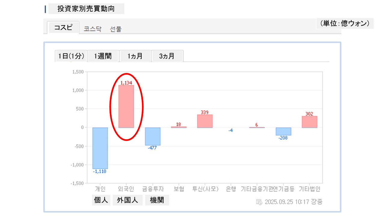 個人投資家は「1,110億ウォン」の売り越し。一方の外国人投資家は「1,134億ウォン」の買い越しです。