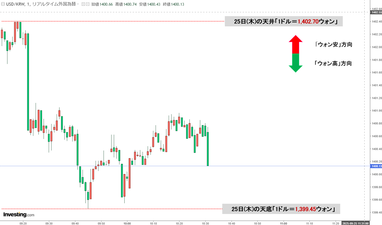2025年09月25日(木)15:30現在、ドルウォンのチャートは以下のようになっています(チャートは『Investing.com』より引用)。現在のところ「1ドル=1,400ウォン」近辺の攻防となっています。ローソク足1本が1分間の値動き...