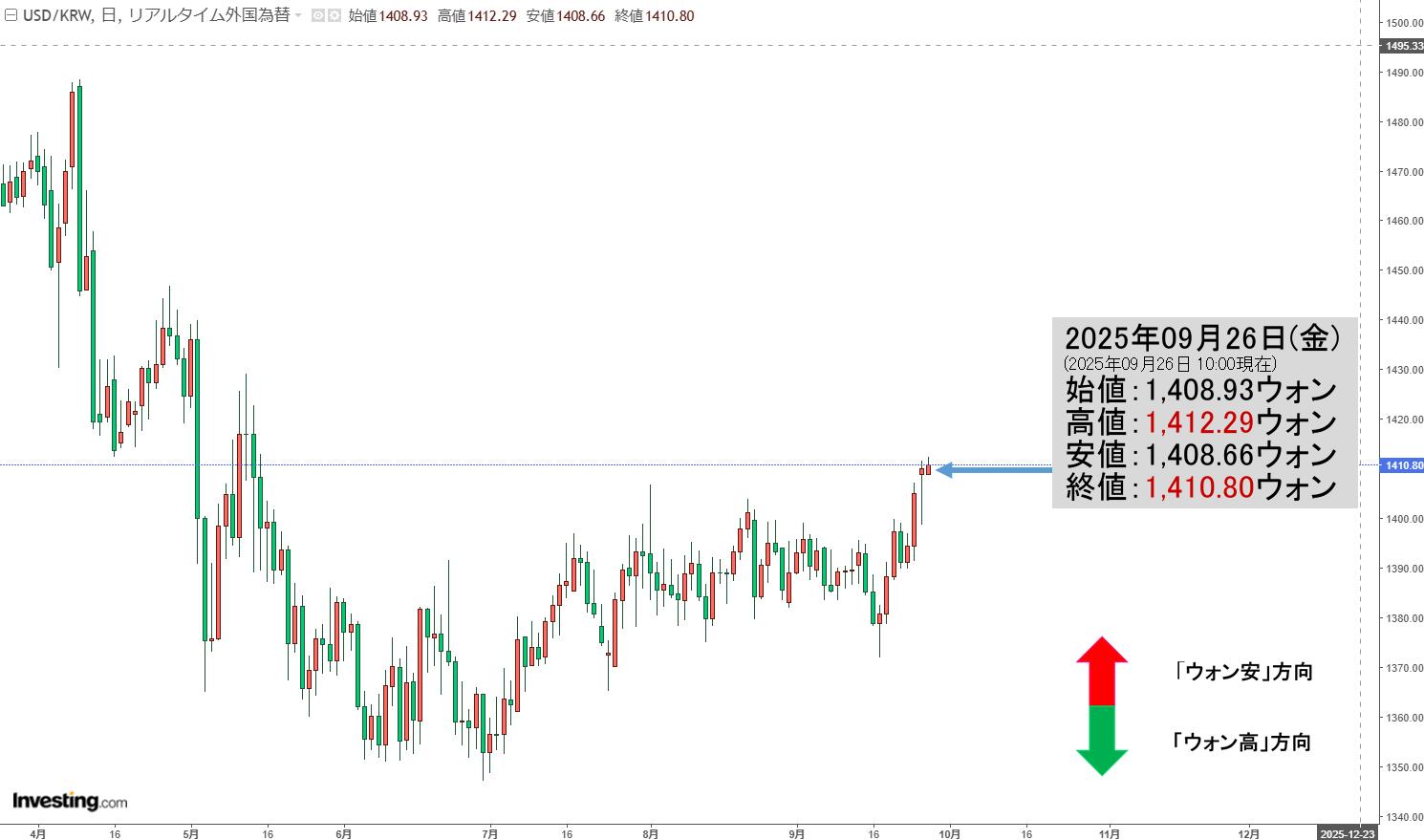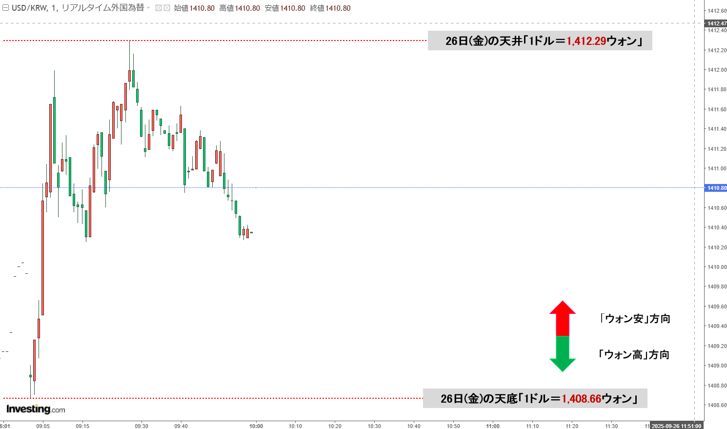 2025年09月26日(金)の市場が開きました。10:00現在、ドルウォンのチャートは以下のようになっています(チャートは『Investing.com』より引用)。