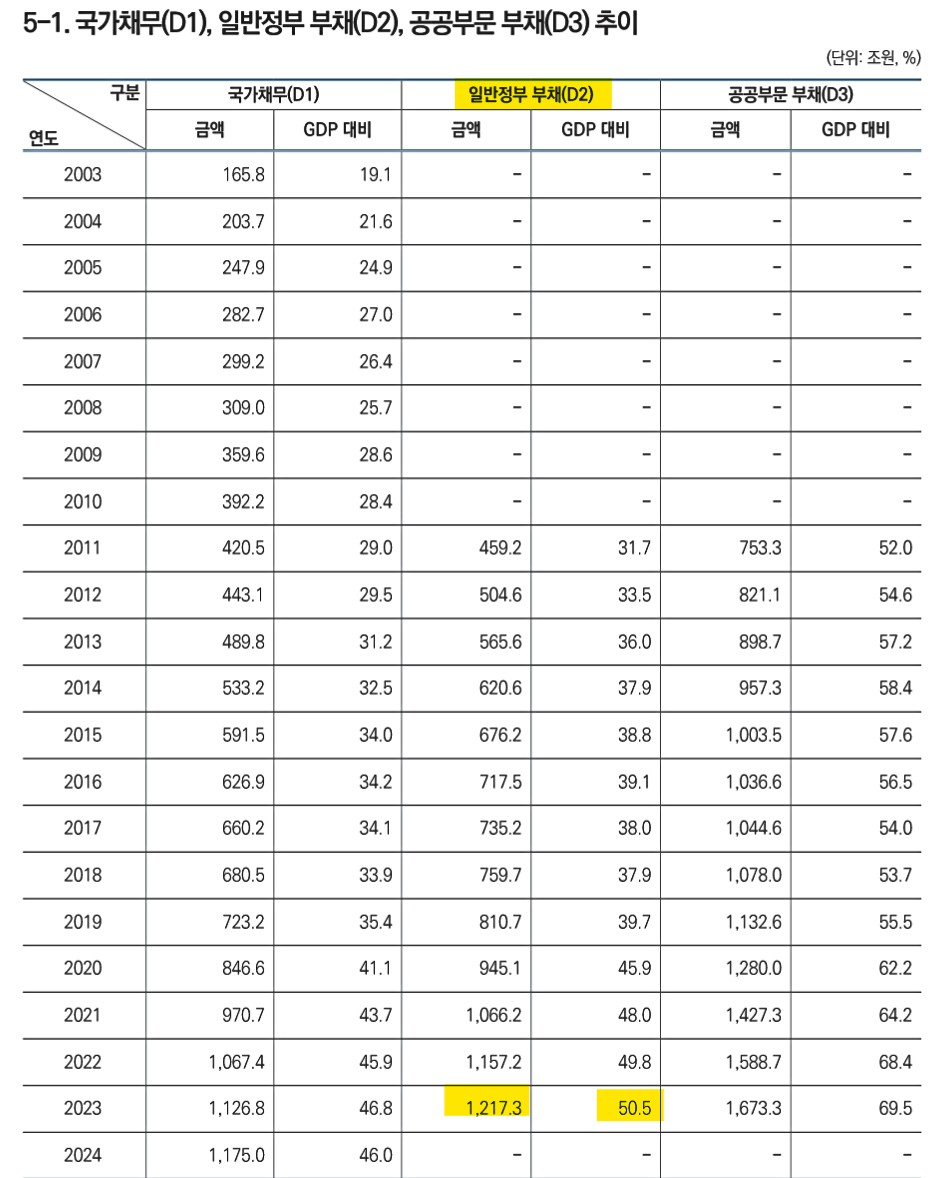 ↑黄色のマーカーが「D2」基準による2023年の政府負債1,217.3兆ウォン。対GDP比は「50.5%」です。