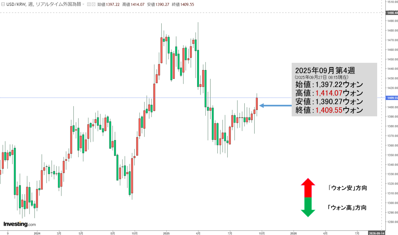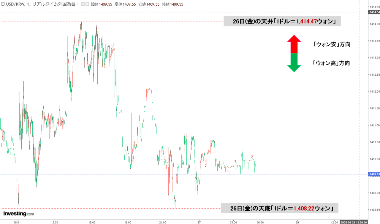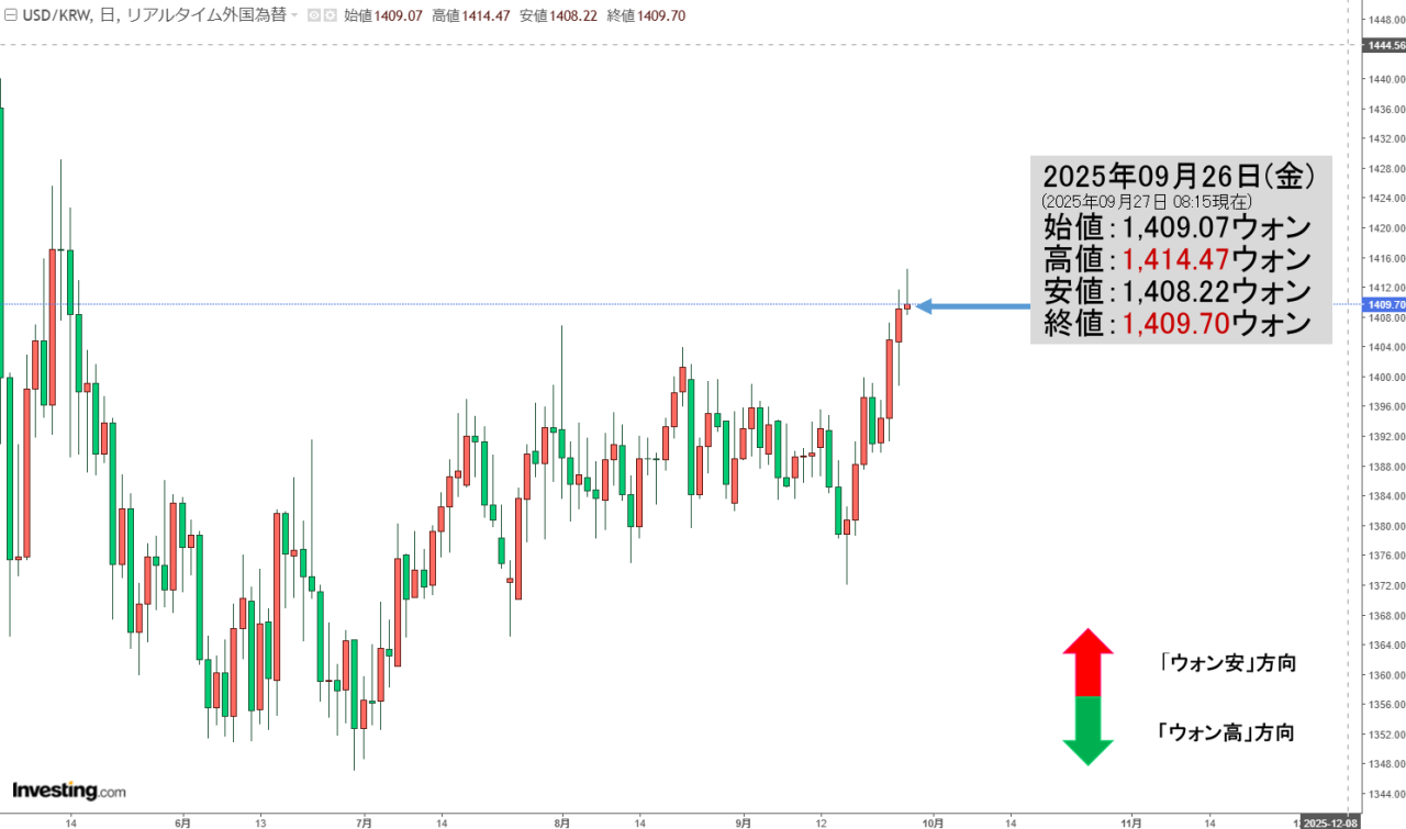 2025年09月26日(金)が(ほぼほぼ)締まりました。2025年09月27日 08:18現在、ドルウォンチャートは以下のようになっています(チャートは『Investing.com』より引用:以下同)。