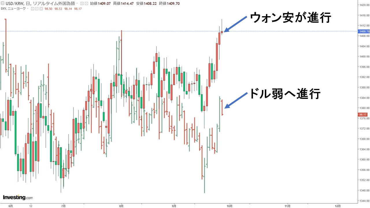 ドルの強弱を示す「DXY」のチャートをドルウォンのチャートに重ねてみます。