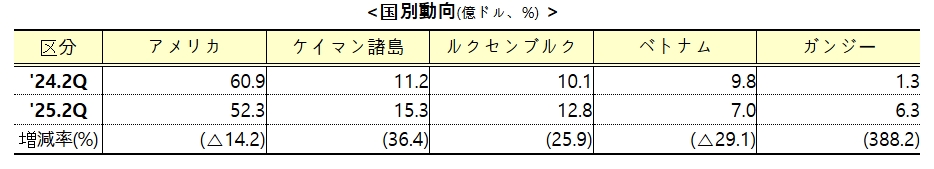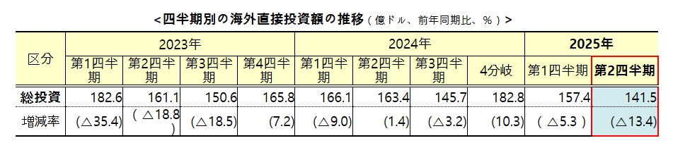 2025年第2四半期(04~06月) 海外直接投資額銀の総投資額は「141.5億ドル」で前年同期(163.4億ドル) 対比で13.4%減少した。