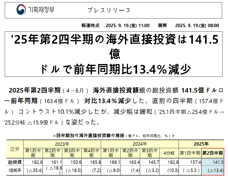 2025年09月19日、韓国の企画財政部から興味深いデータが出ました。「2025年第2四半期の対外直接投資」の金額です。