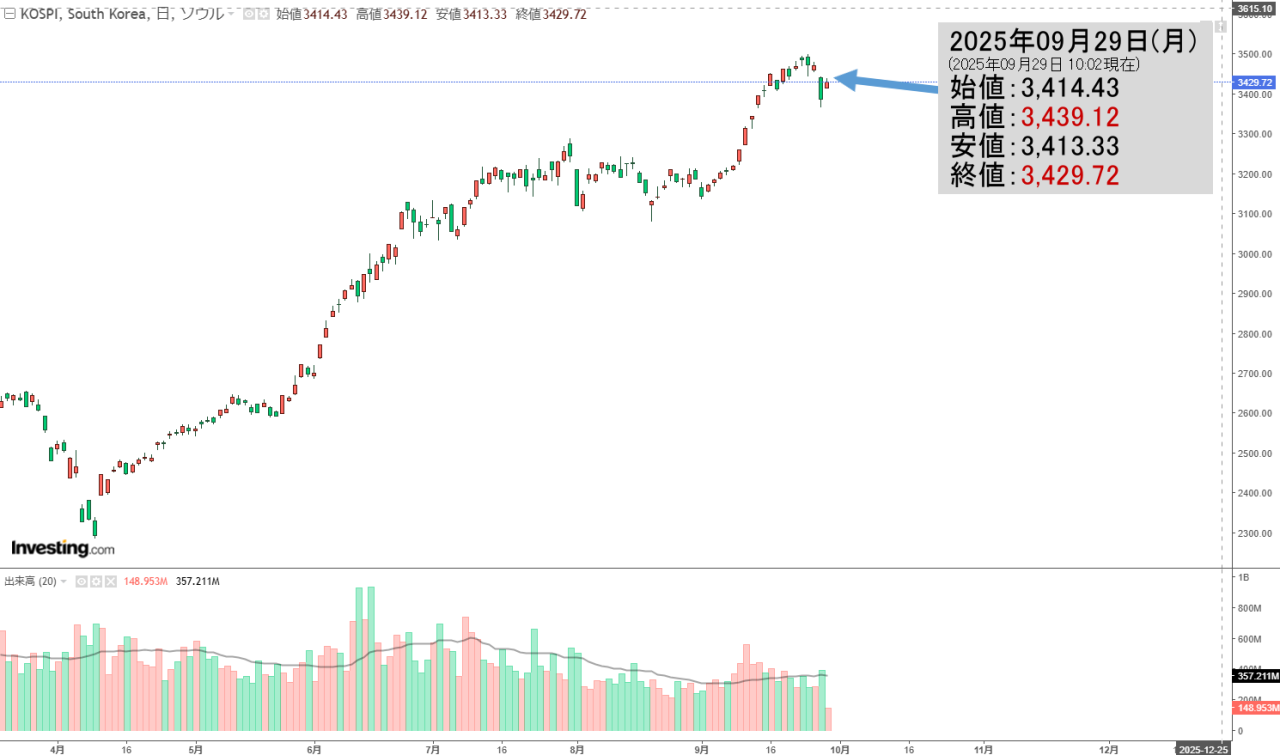 2025年09月29日(月)の韓国株式市場が締まりました。15:31現在、KOSPI(韓国総合株価指数)のチャートは以下のようになっています(チャートは『Investing.com』より引用)。陽線で終わりました。前日の下落からの戻しです。...