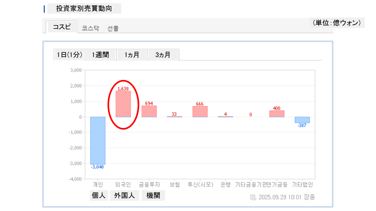 個人投資家は「3,048億ウォン」の売り越し。一方の外国人投資家は「1,638億ウォン」の買い越しです。