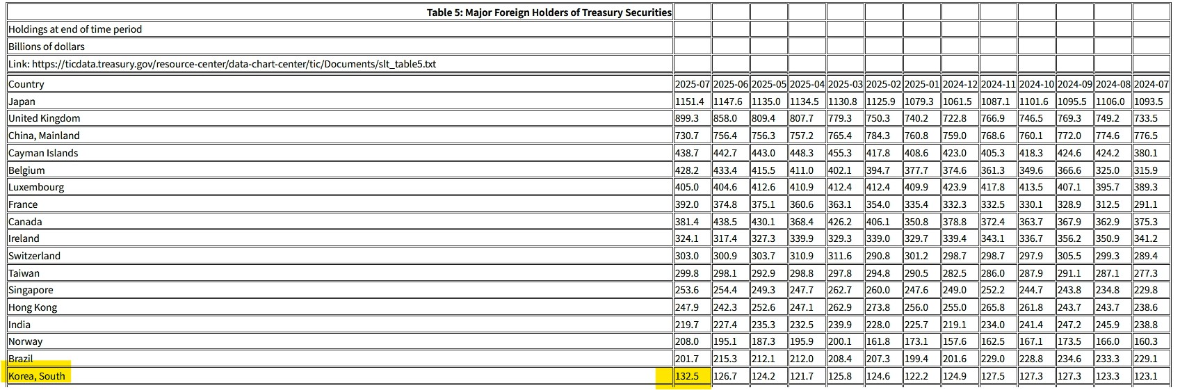 ↑アメリカ合衆国財務省が毎月公開している「合衆国公債の主要ホルダーの保有金額」。直近は2025年07月末時点でのデータ。韓国は黄色のマーカーでフォーカスした金額「1,325億ドル」になります。