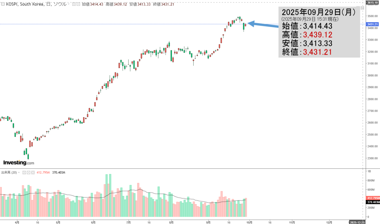 2025年09月29日(月)の韓国株式市場が締まりました。15:31現在、KOSPI(韓国総合株価指数)のチャートは以下のようになっています(チャートは『Investing.com』より引用)。