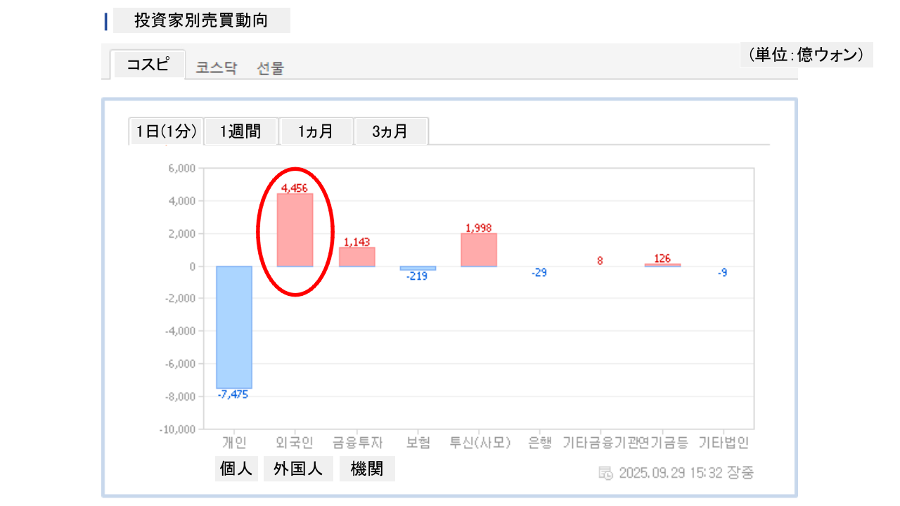 個人投資家は「7,475億ウォン」の売り越し。一方の外国人投資家は「4,456億ウォン」の買い越しです。