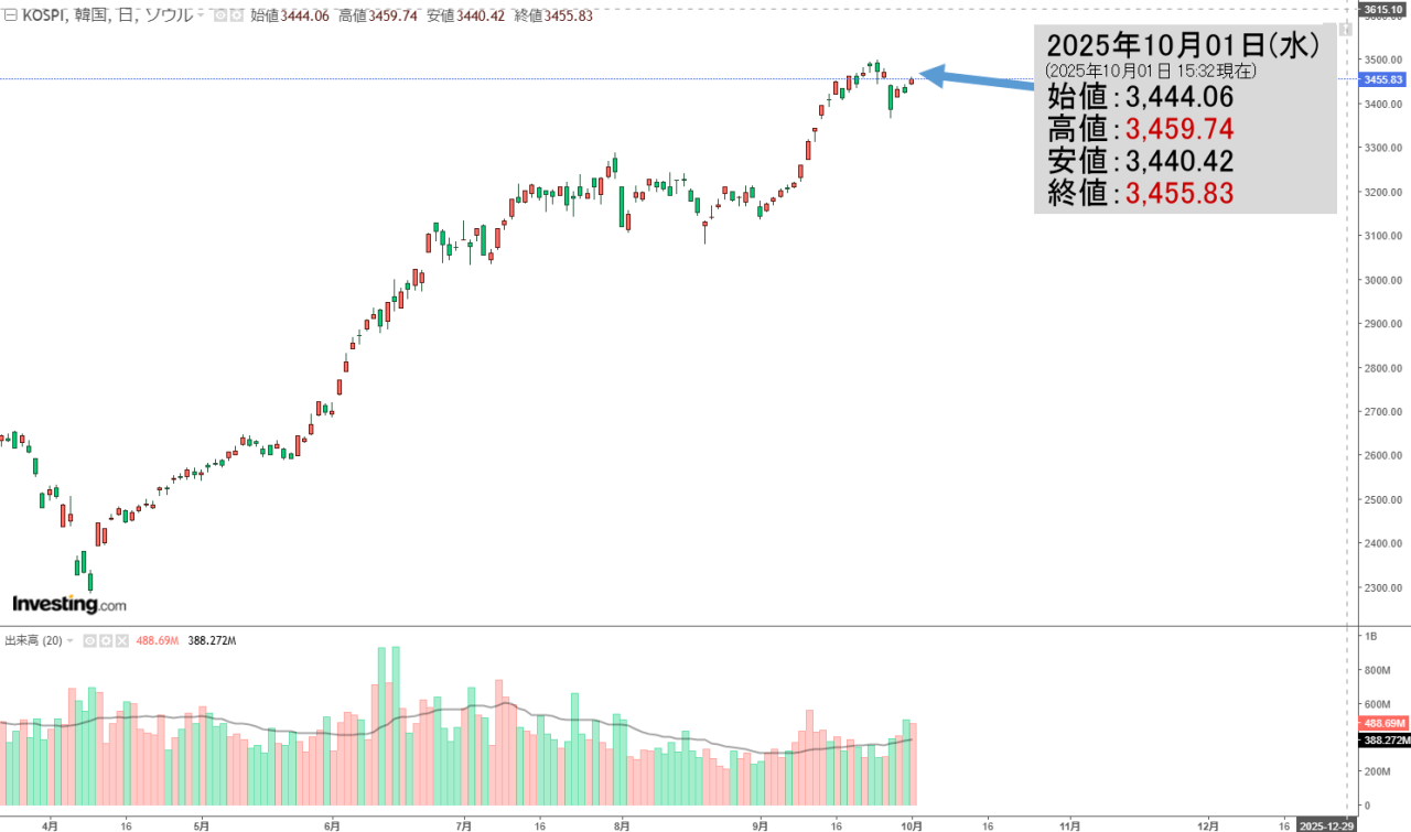 2025年10月01日(水)の韓国株式市場が締まりました。15:32現在、KOSPI(韓国総合株価指数)のチャートは以下のようになっています(チャートは『Investing.com』より引用)。