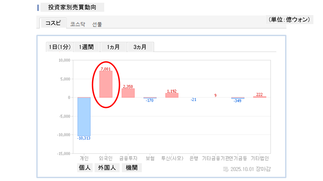個人投資家は「1兆313億ウォン」の売り越し。一方の外国人投資家は「7,081億ウォン」の買い越しです。