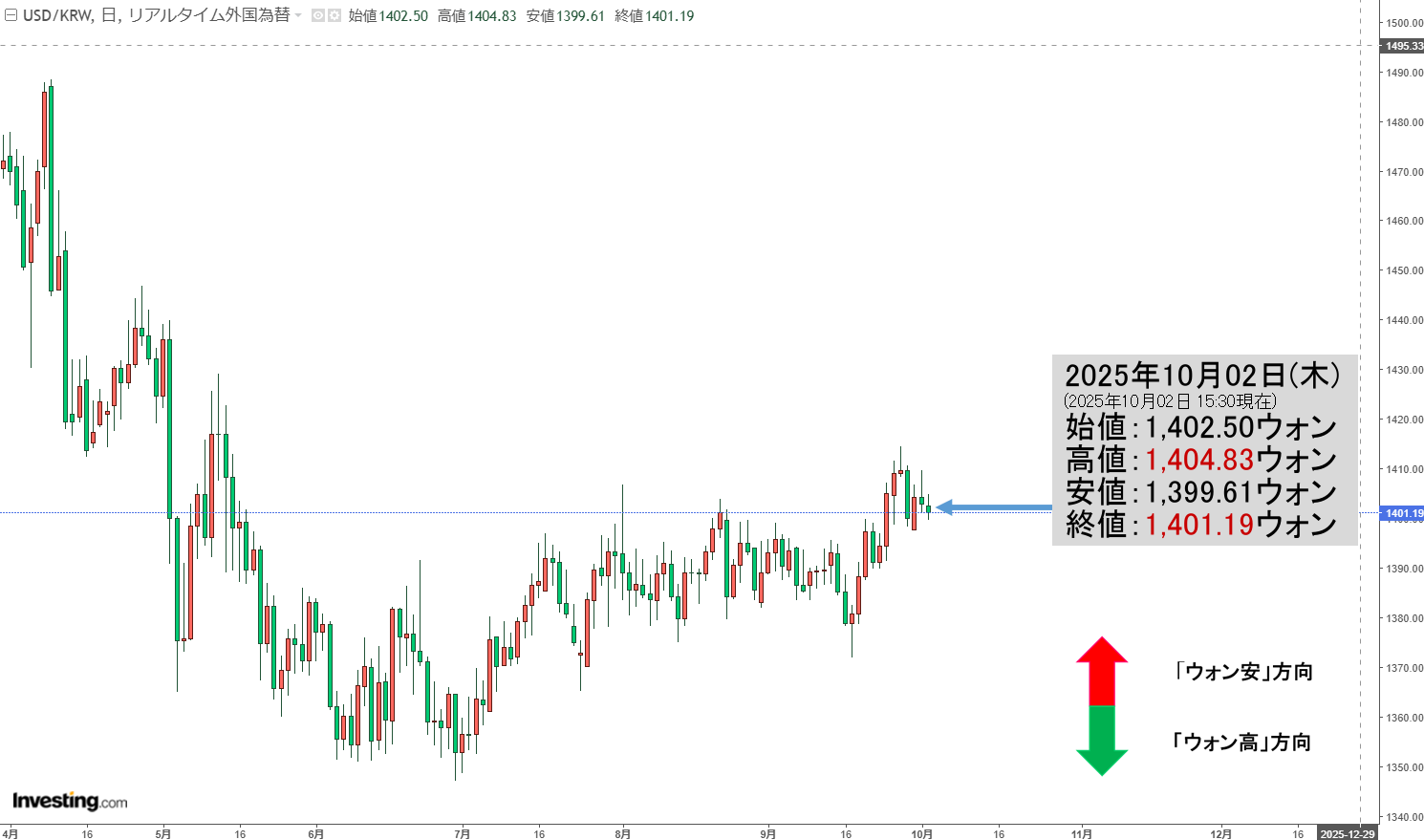 2025年10月02日(木)15:30現在、ドルウォンのチャートは以下のようになっています(チャートは『Investing.com』より引用)。