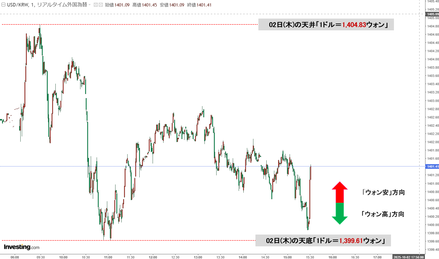 2025年10月03日(金)の市場が開きました。10:00現在、ドルウォンのチャートは以下のようになっています(チャートは『Investing.com』より引用)。現在のところ「1ドル=1,407ウォン」近辺の攻防となっています。ローソク足…