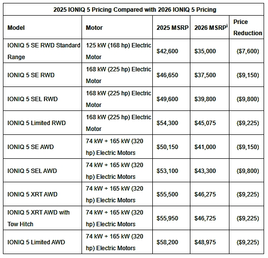 電気自動車、2026年型「IONIQ5」を以下のように値下げします。