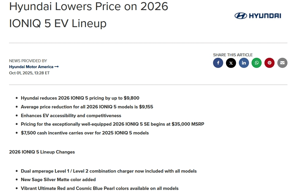 上掲のとおり、2026年型「IONIQ5」の価格を引き下げましたが、在庫の2025年型には「7,500ドル」の現金インセンティブを続けると発表しました。