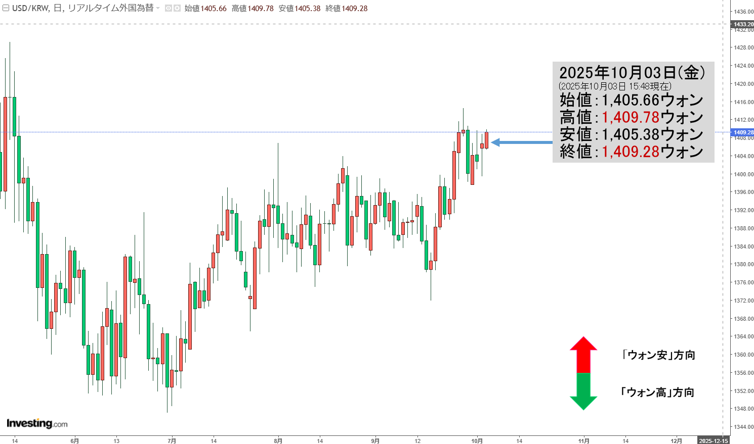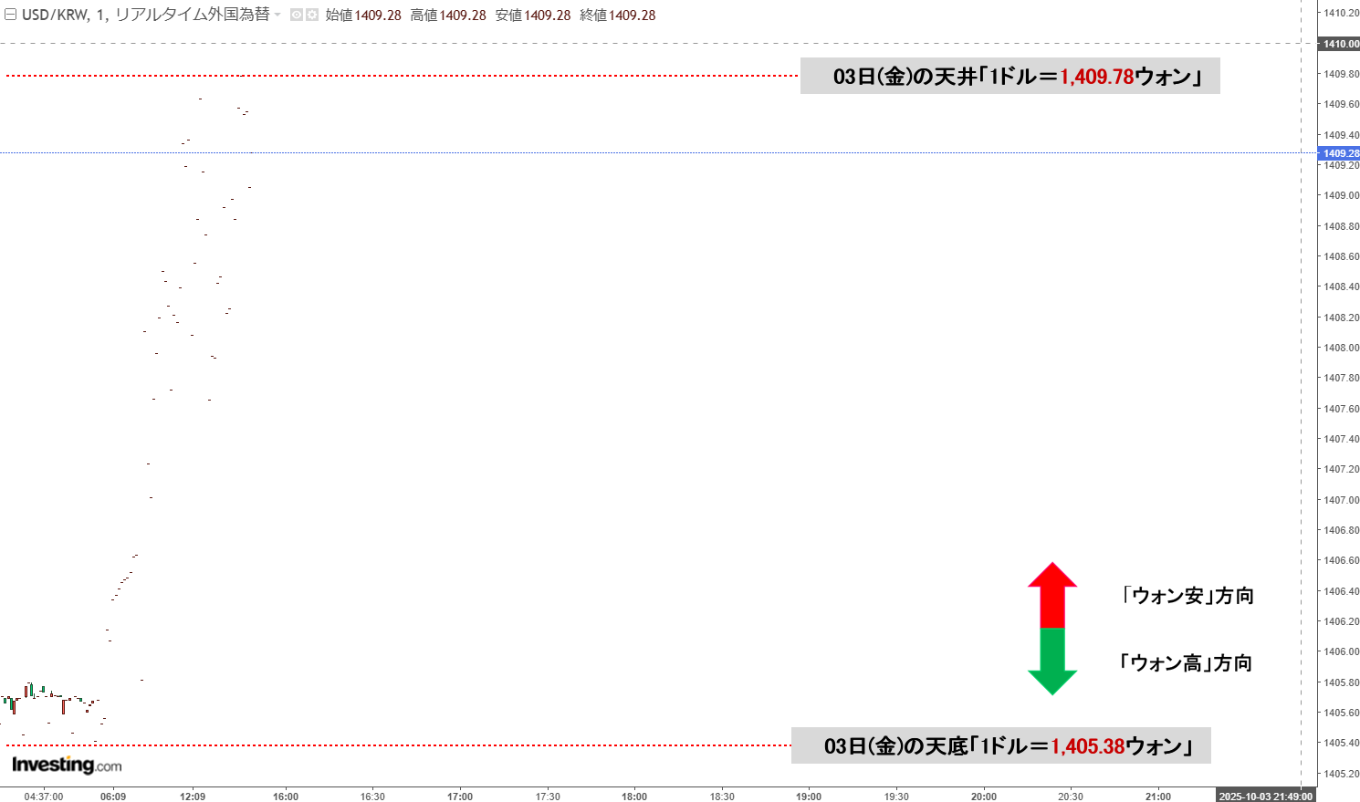 2025年10月03日(金)が(ほぼほぼ)締まりました。2025年10月04日 09:49現在、ドルウォンチャートは以下のようになっています(チャートは『Investing.com』より引用:以下同)。ローソク足1本が1分間の値動きを示す「...