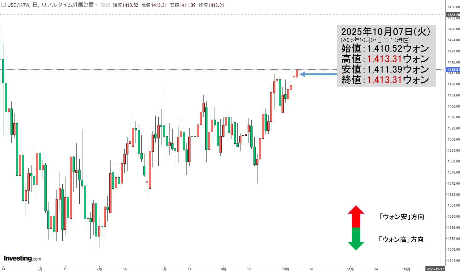 2025年10月07日(火)の市場が開きました。10:10現在、ドルウォンのチャートは以下のようになっています(チャートは『Investing.com』より引用)。
