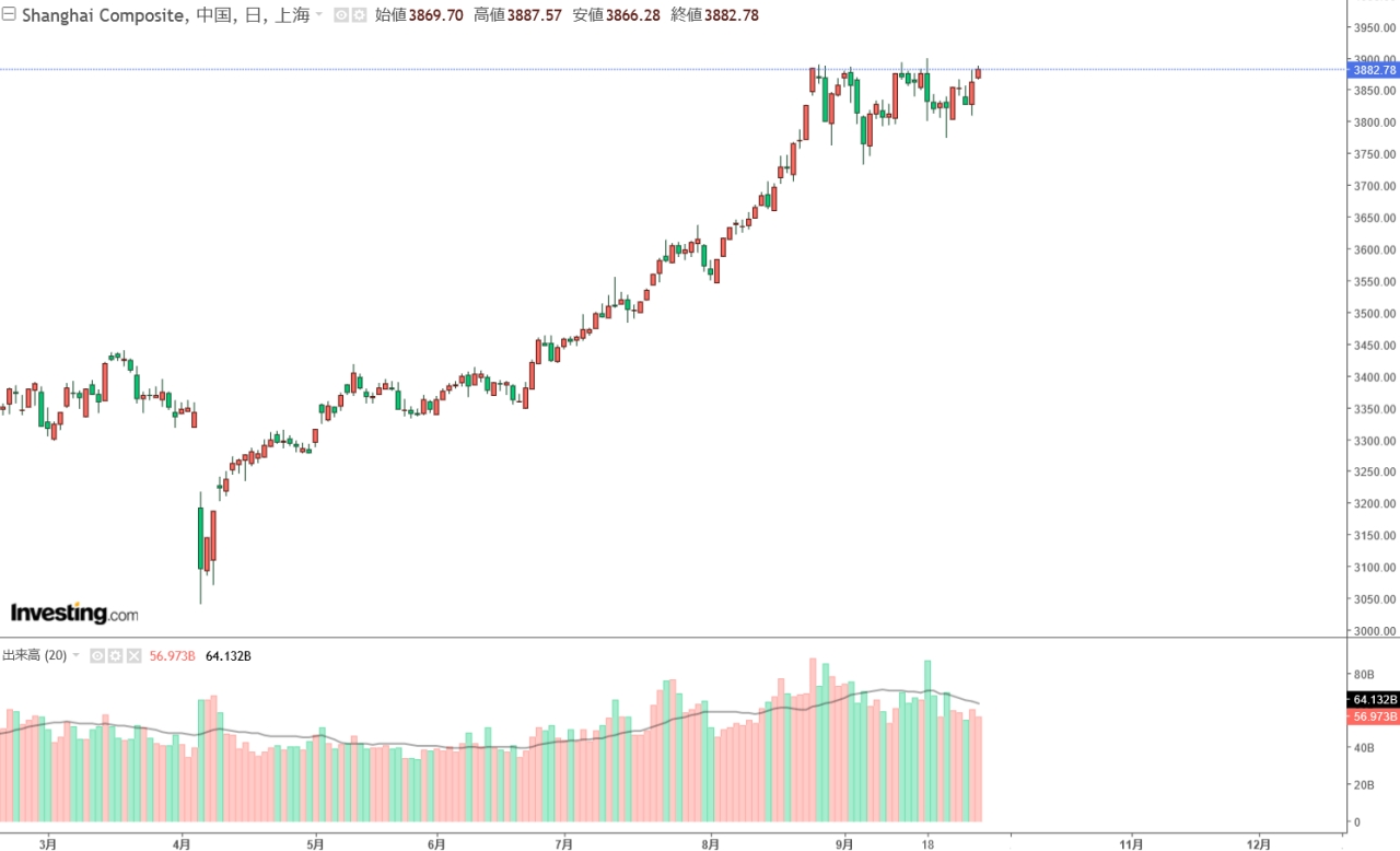 実は、韓国の皆さんが中国株式市場に投入する金額が増加してるというデータもあります。上掲は「上海総合」ですが、株価は上昇しています(チャートは『Investing.com』より引用)。