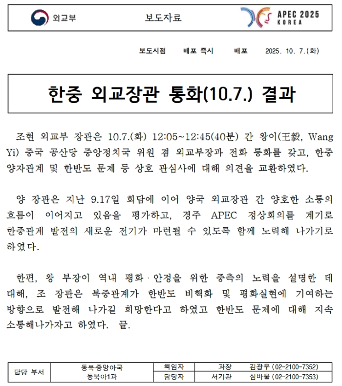 趙賢(チョ・ヒョン)外交部長官は、10月07日(火)12時05分から12時45分までの40分間、王毅(Wang Yi)中国共産党中央政治局委員兼外交部長と電話会談を行い、中韓二国間関係および朝鮮半島問題など、双方の関心事について意見を交換した。