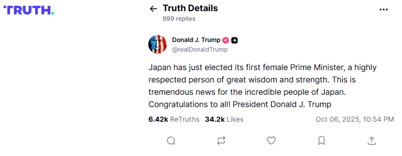2025年10月02日、『自民党』総裁に高市早苗さんが選出されたことについて、トランプ大統領が『True Social』に行った投稿