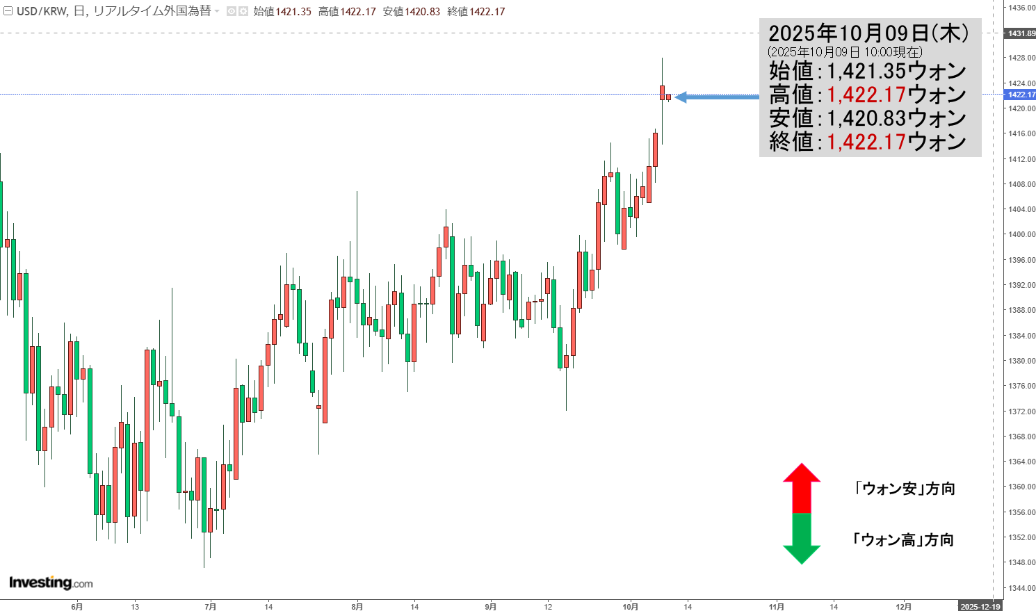 2025年10月09日(木)の韓国時間15:30現在、ドルウォンのチャートは以下のようになっています(チャートは『Investing.com』より引用)。現在のところ「1ドル=1,422ウォン」近辺の攻防となっています。現在の天井は「1ドル...