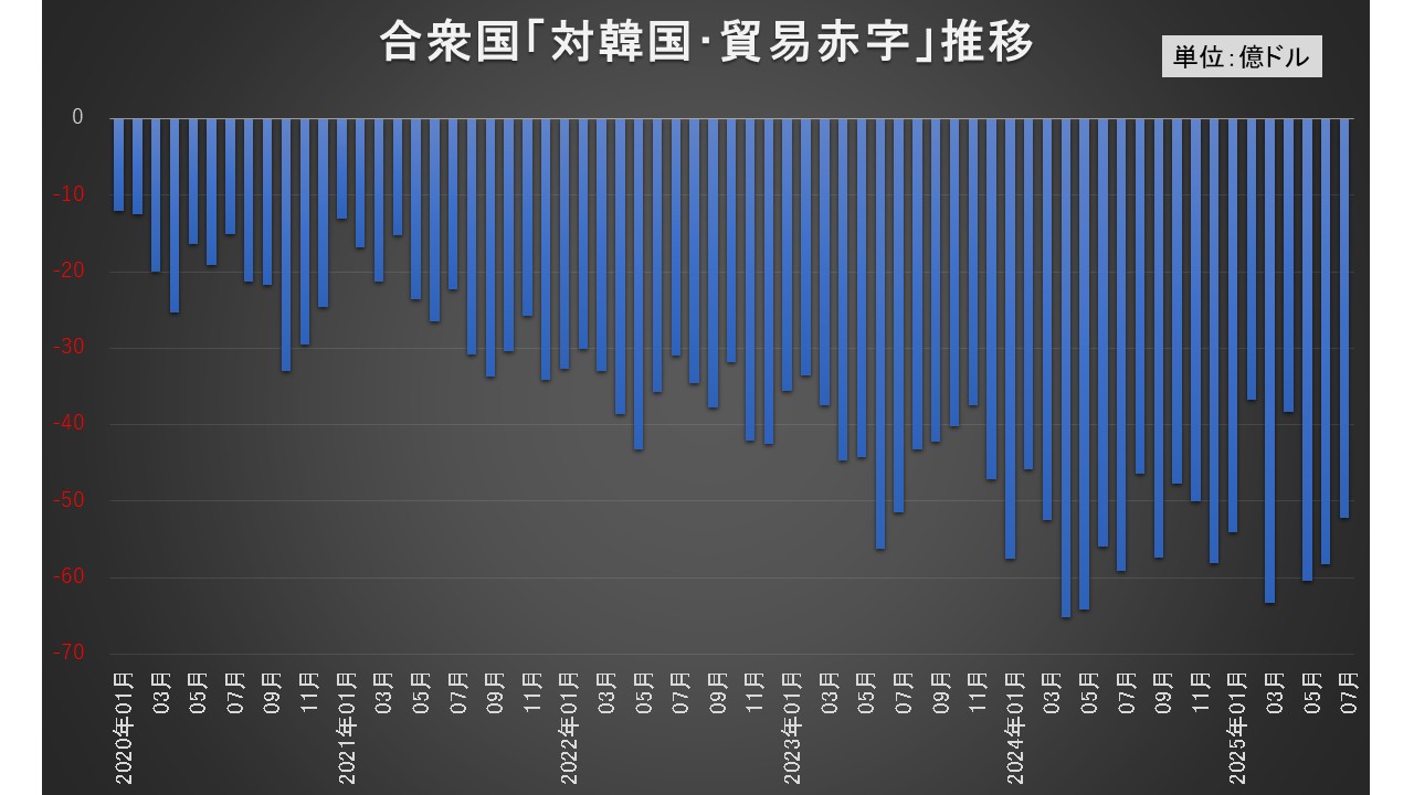 実際、韓国の「対合衆国の貿易収支」がどのように推移しているのか、2020年01月~2025年07月を見ると以下のようになります。