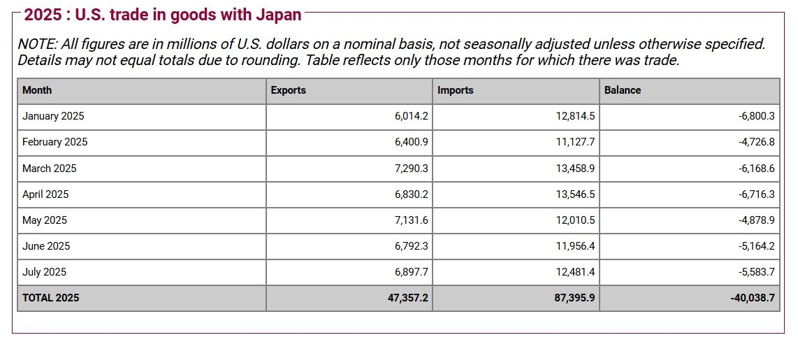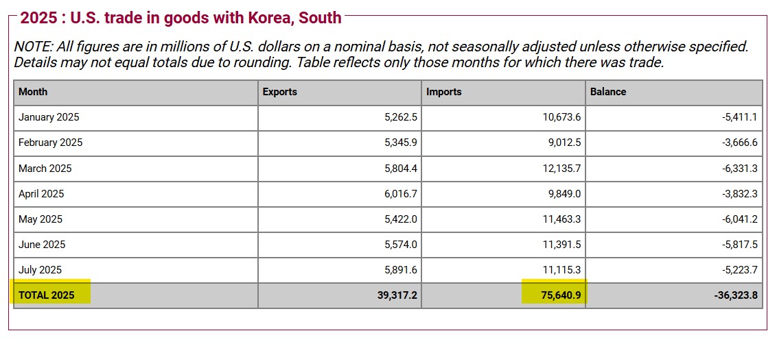 ↑黄色でフォーカスしてあるのが合衆国の対韓国輸入の総計(2025年01~07月累計)。合衆国から見たデータですので、外国からの輸入(Imports)はその国から見ると輸出(Exports)になります。物品(Goods)の輸出入データです。データ出典:『United States Census Bureau(合衆国 国勢調査局)