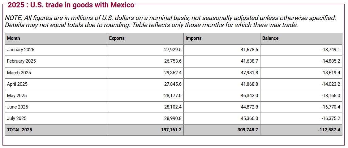 最も合衆国に輸出金額が多いメキシコは以下のように2025年01~07月累計で「3,097億4,870万ドル」です。