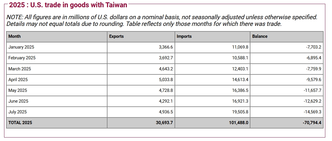 台湾は2025年01~07月累計で「1,014億8,800万ドル」なので、確かに韓国の「756億4,090万ドル」よりも対合衆国輸出額は大きいです。
