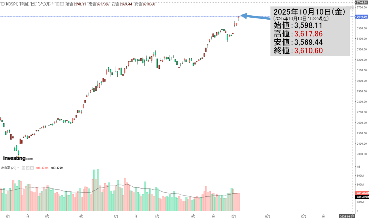 2025年10月10日(金)の韓国株式市場が締まりました。15:32現在、KOSPI(韓国総合株価指数)のチャートは以下のようになっています(チャートは『Investing.com』より引用)。