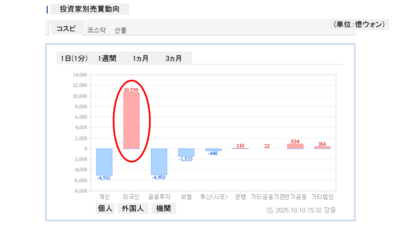 個人投資家は「4,992億ウォン」の売り越し。一方の外国人投資家は「1兆599億ウォン」の買い越しです。