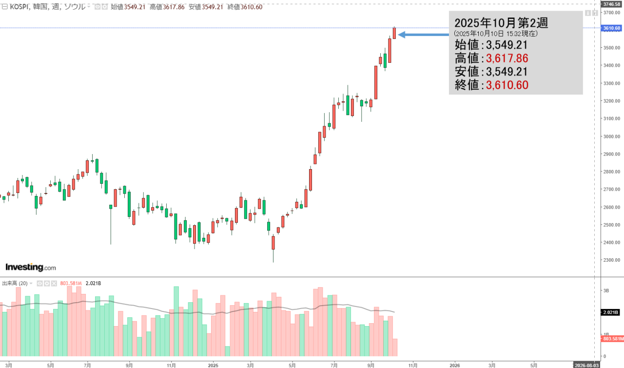 2025年10月13日(月)の韓国株式市場が開きましたので、KOSPIチャートの初動状況を以下の記事にまとめました。本記事と併せてお読み頂ければ幸いです。