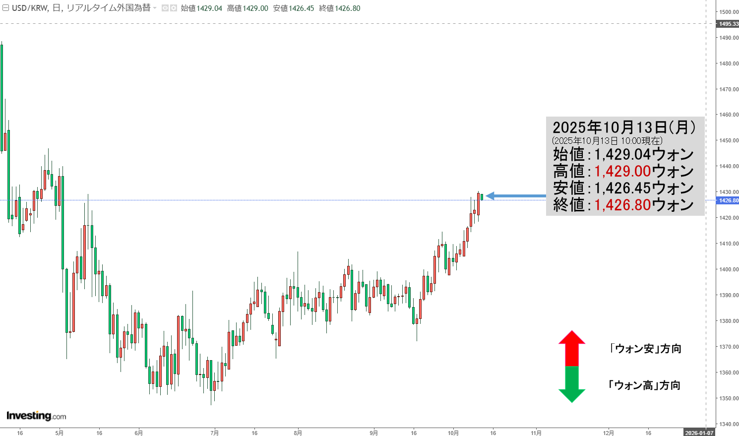 2025年10月13日(月)15:43現在、ドルウォンのチャートは以下のようになっています(チャートは『Investing.com』より引用)。陰線が伸びました。現在のところ「1ドル=1,426ウォン」近辺の攻防となっています。現在の天井は...