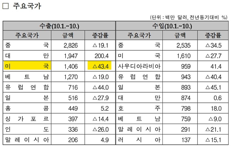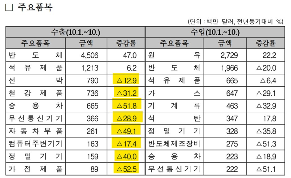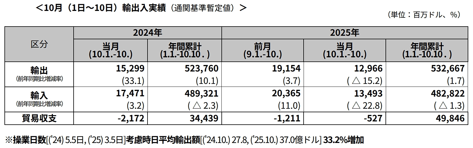 韓国の関税庁が「2025年10月01~10日の輸出入の現況」のデータを公表しました。以下をご覧ください。