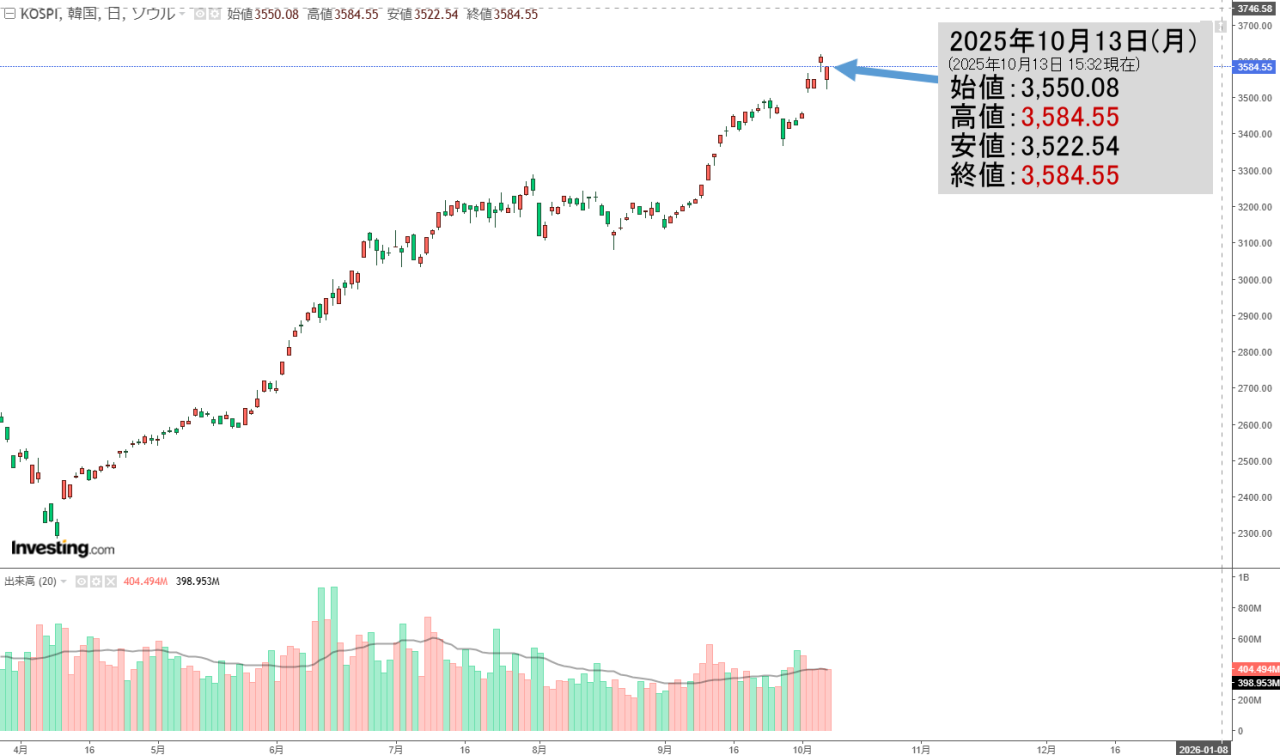 「韓国株式市場」10月14日(火)初動・KOSPI「3,632」ギャップアップ。