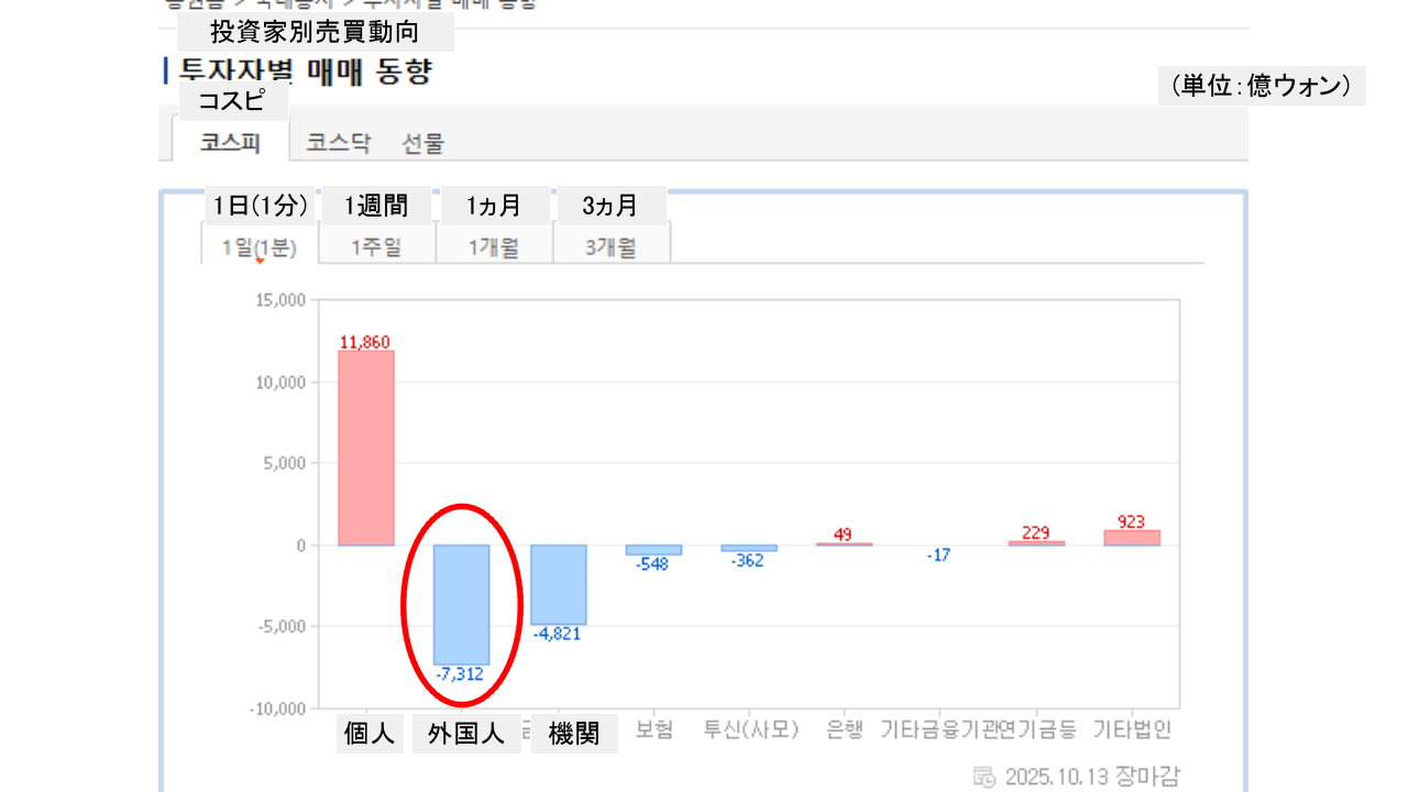 個人投資家は「1兆1,860億ウォン」の買い越し。一方の外国人投資家は「7,312億ウォン」の売り越しです。
