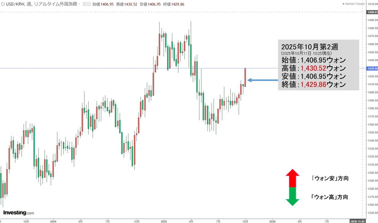 上掲は2025年10月10日(金)、市場終了時点でのドルウォンチャートですが、長い陽線となりました(チャートは『Investing.com』より引用:以下同)。
