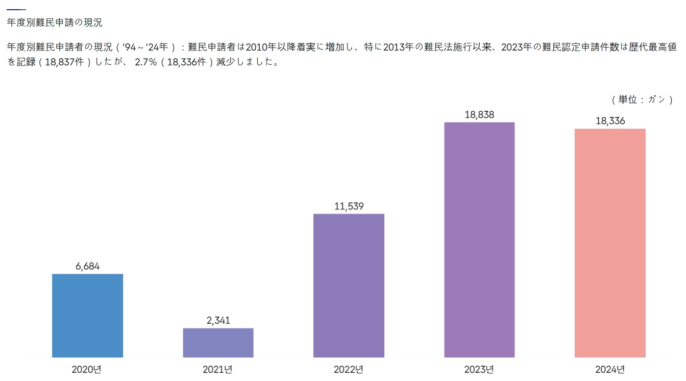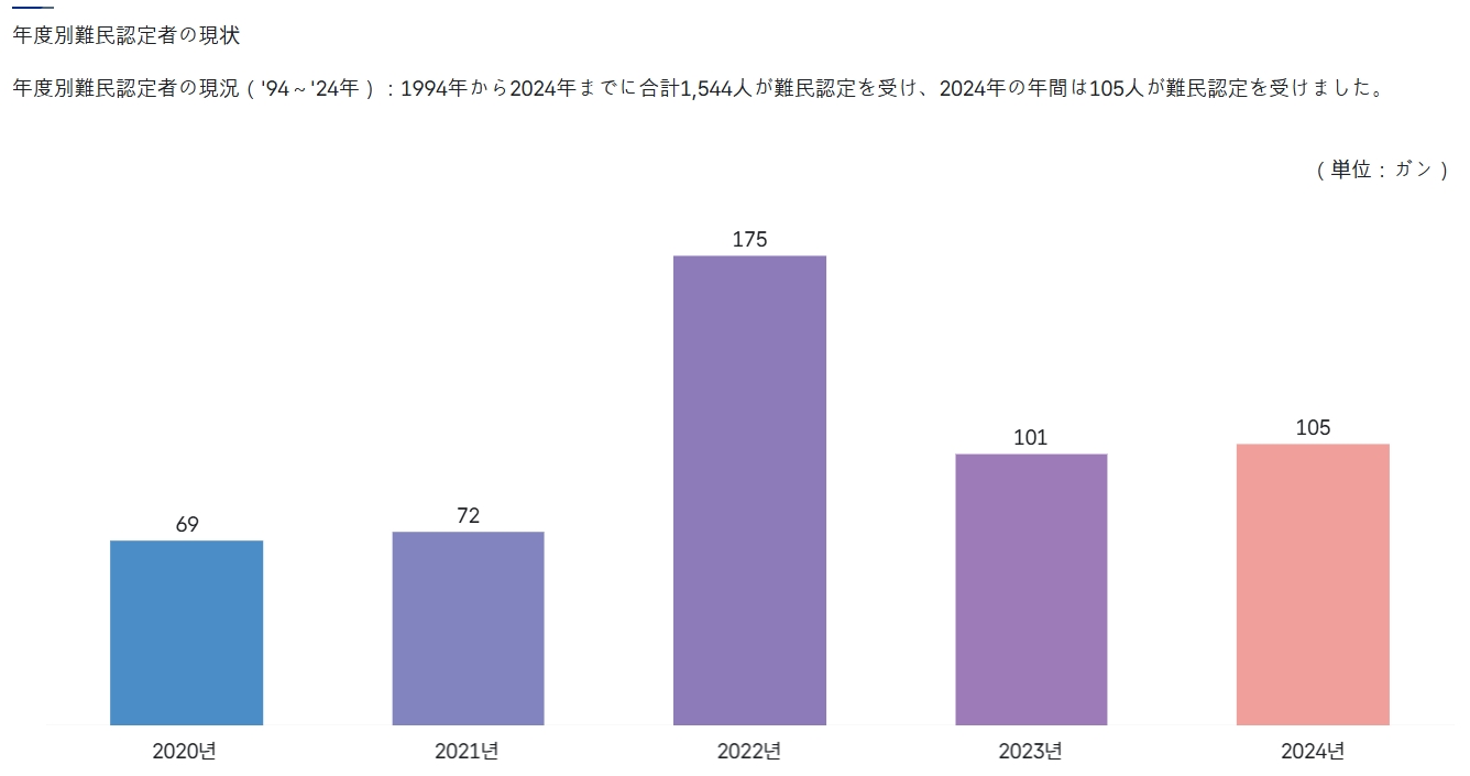 ↑難民認定は2024年「105件」でした。⇒参照・引用元:『韓国 法務部』公式サイト「難民」
