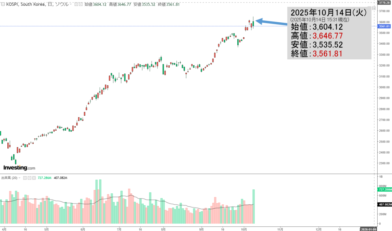 2025年10月15日(水)の韓国株式市場が開きました。10:02現在、KOSPI(韓国総合株価指数)のチャートは以下のようになっています(チャートは『Investing.com』より引用)。上げ始まりで陽線です。KOSPIは「3,602」...