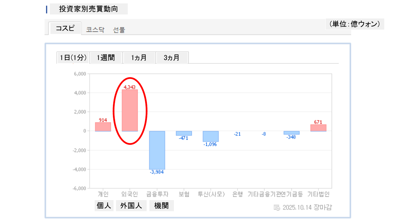 個人投資家は「914億ウォン」の買い越し。一方の外国人投資家は「4,343億ウォン」の買い越しです。