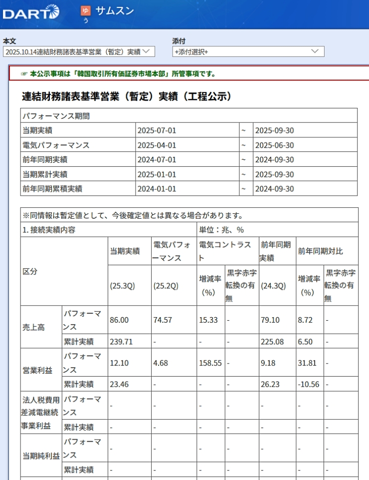 2025年も第3四半期の業績が公開されるシーズンになりました。2025年10月14日、注目の『サムスン電子』の暫定業績が公示されました。