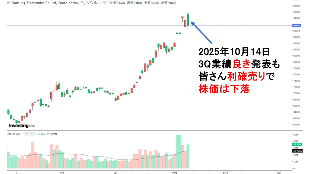 ※『サムスン電子』は韓国の「国民株」といわれる銘柄。株価の水準よって「6万電子」「8万電子」などの呼び方がされます。「いくか10万電子!?」だったのですが、第3四半期の結果が一応出たので、一服つきました。