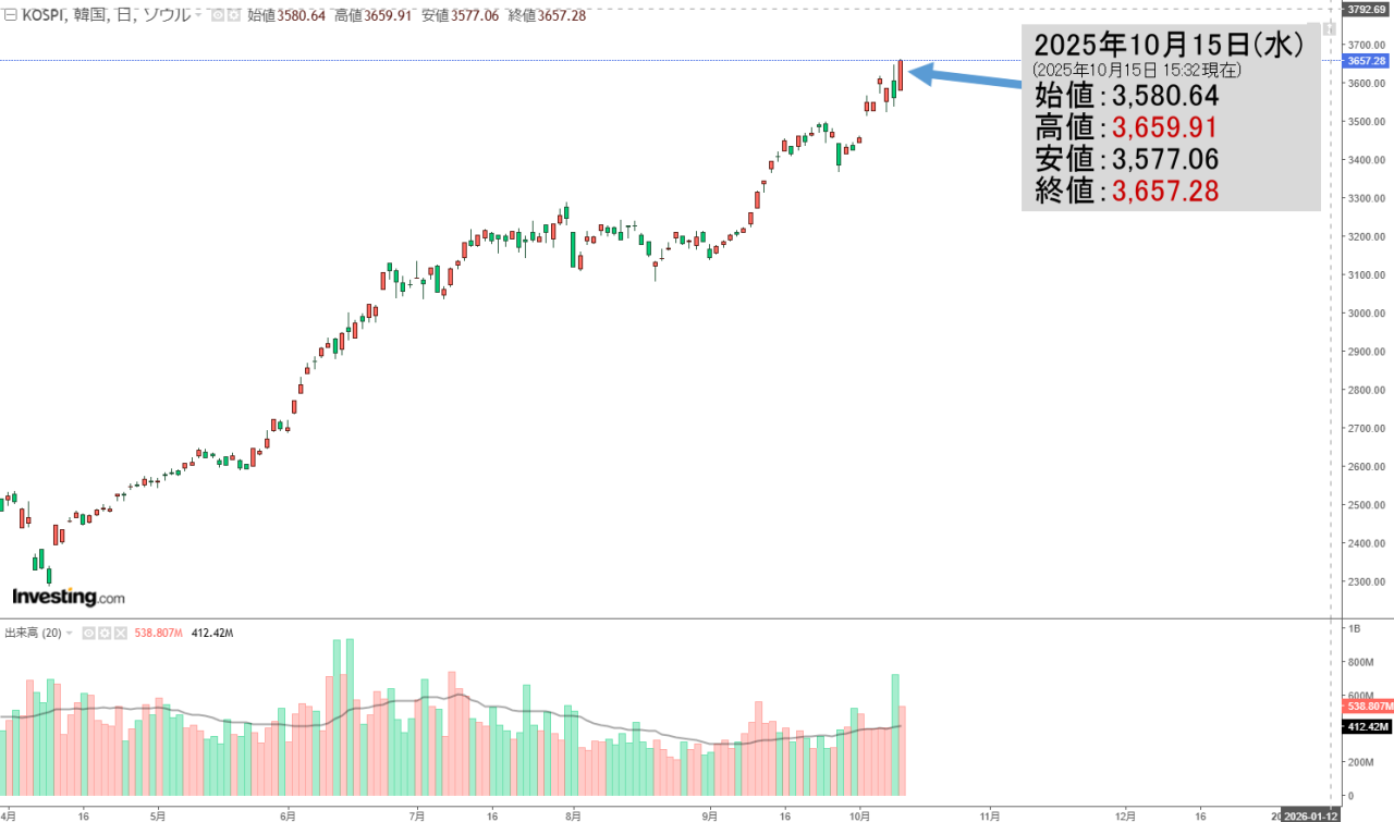 「韓国株式市場」10月16日(木)初動・KOSPI「3,722」