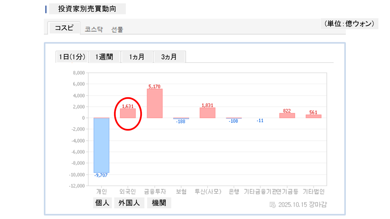 個人投資家は「9,707億ウォン」の売り越し。一方の外国人投資家は「1,631億ウォン」の買い越しです。