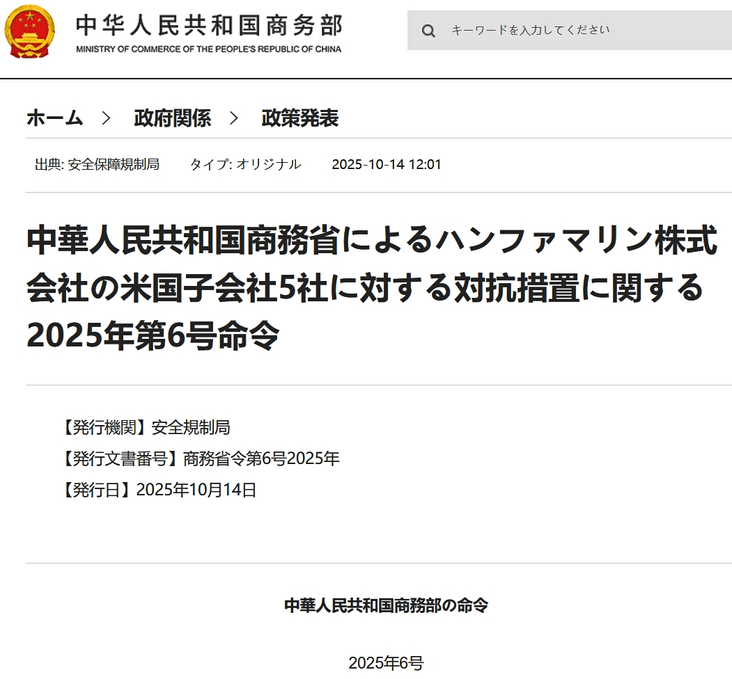 ⇒参照・引用元:『中国 商務部』公式サイト「中华人民共和国商务部令二〇二五年第6号 关于对韩华海洋株式会社5家美国相关子公司采取反制措施的决定」
