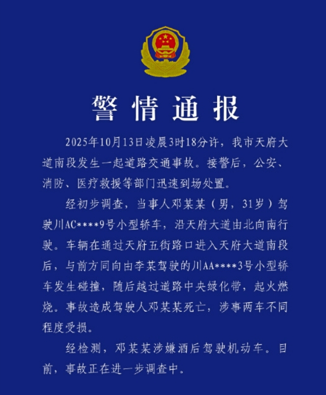 2025年10月13日午前3時18分ごろ、本市天府大道南区間において1件の道路交通事故が発生した。