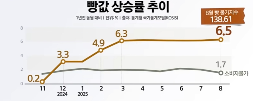 ↑対前年同月比の「パン価格上昇率の推移」です。例の『国家情報資源管理院』の電算室火災によって『KOSIS』がいまだ止まっており、データを取得できませんので『YTN』の報道から引用します。