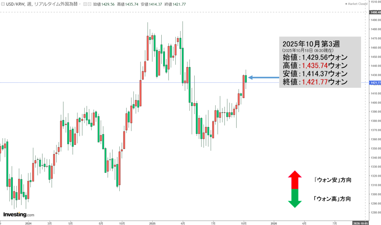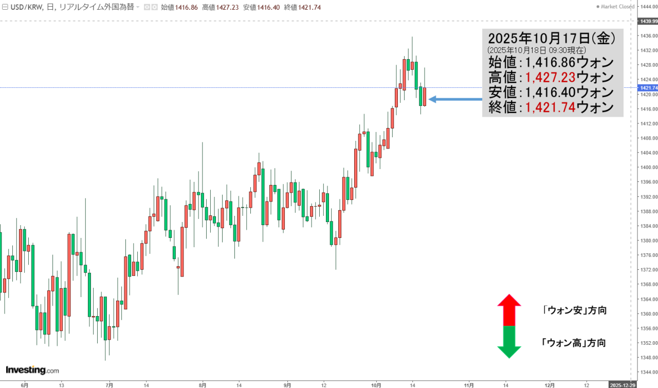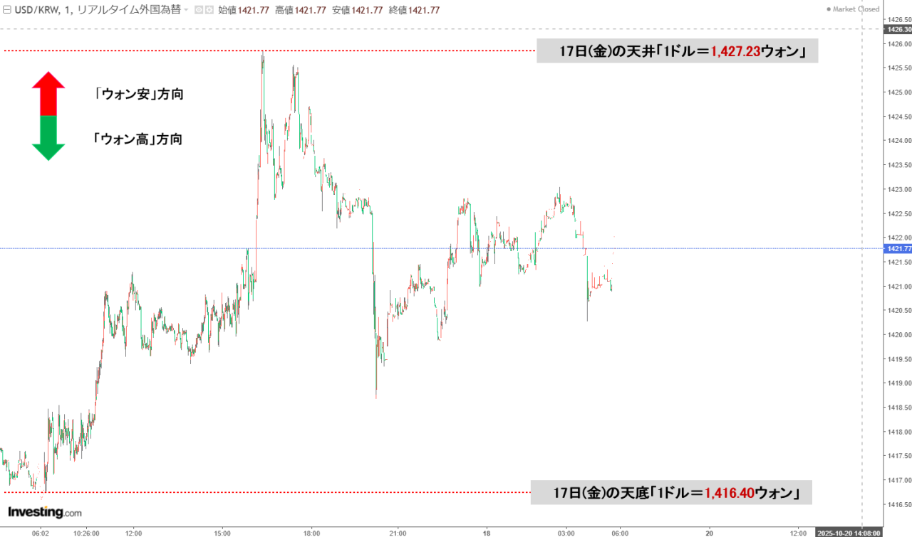 2025年10月20日(月)の市場が開きました。10:14現在、ドルウォンのチャートは以下のようになっています(チャートは『Investing.com』より引用)。現在のところ「1ドル=1,420ウォン」近辺の攻防となっています。ローソク足...