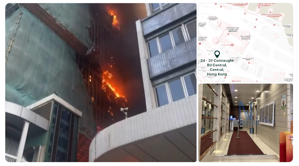住所は「34-37 Connaught Road Central」ですから、まさに香港の心臓部です。下掲はYouTubeに上がった本火災の動画ですが、街の中心部で火災が発生したことがよく分かります。