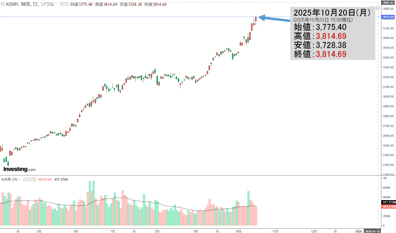 2025年10月20日(月)の韓国株式市場が締まりました。15:38現在、KOSPI(韓国総合株価指数)のチャートは以下のようになっています(チャートは『Investing.com』より引用)。